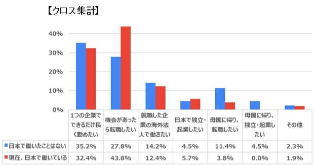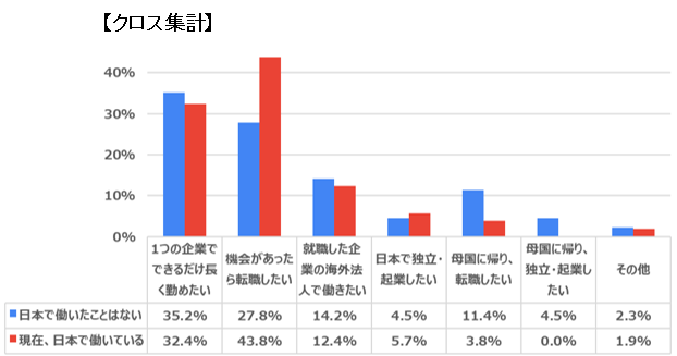 クロス集計で見てみると、「機会があったら転職したい」の割合は、日本で働いたことがない人(N=176)は27.8%に対し、現在日本で働いている人(N=105)は43.8%と大きな差がありました。これは、アンケートの対象が外国人留学生就職情報サイト『リュウカツ』登録者であり、そのうち現在日本で働いている人たちは転職を検討していることが考えられるためです。