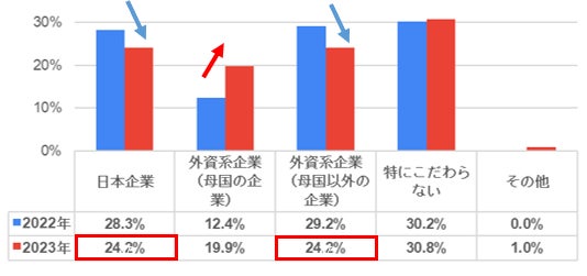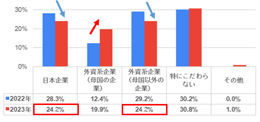 「日本企業」(24.2%)と「外資系企業(母国以外の企業)」(24.2%)がそれぞれ昨年から減り、同数という結果に。一方、「外資系企業(母国の企業)」(19.9%)は昨年比7.5pt増となり、差が縮まりました。最も多かった「特にこだわらない」(30.8%)は、昨年とほぼ同数で、企業の種類にこだわらない人が多いことがわかりました。