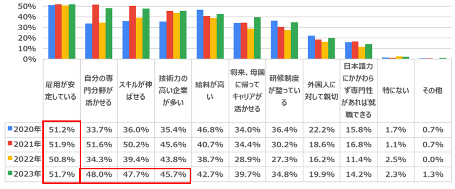 【アンケート結果】第5回 理系外国人留学生の会社選びとキャリアプラン 日本企業に就職する魅力は「雇用が安定している」(51.7%)が4年連続1位