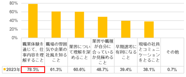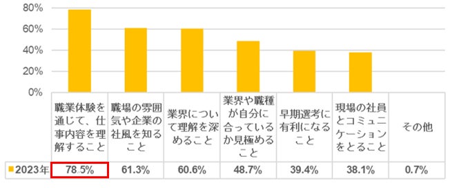 約8割(78.5%)が「職業体験を通じて、仕事内容を理解すること」と回答。次いで「職場の雰囲気や企業の社風を知ること」(61.3%)と「業界について理解を深めること」(60.6%)が約6割となり、ほぼ同数になりました。