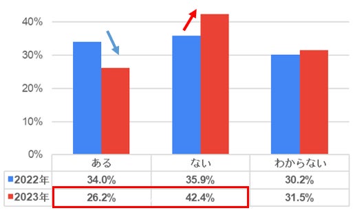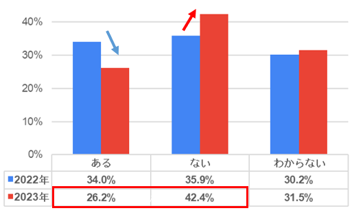 昨年は「ある」と「ない」がほぼ同じ割合でしたが、今年は「ある」(26.2%)が昨年比7.8pt減、「ない」(42.4%)が昨年比6.5pt増となり、差が開きました。