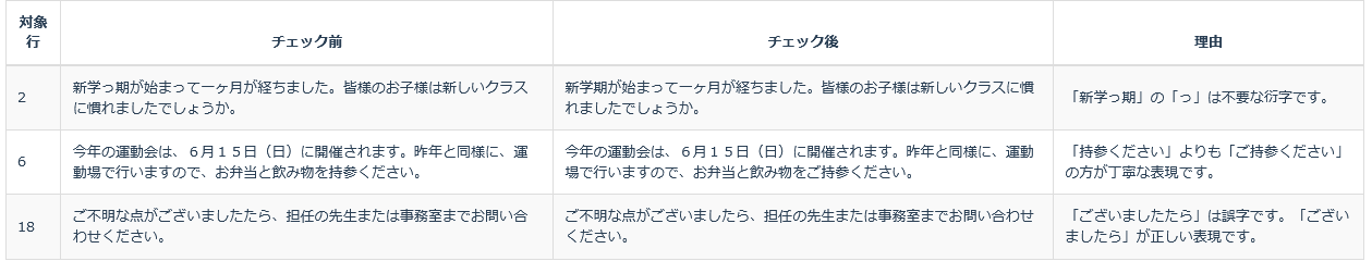 特に注目すべきは、『AIでメッセージ確認機能』の大幅な性能向上です。今回新たに提供するβ版では、文章中の誤字脱字や文法の誤りをより的確に検出し、具体的な修正内容とアドバイスを表示することが可能になりました。文章校正の精度が高まったことにより、教職員の業務であるメッセージの草案作成やメッセージの校正作業の効率を大幅に向上させることができます。