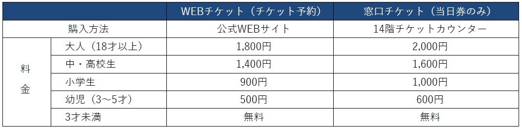 フロア : 14階(チケットカウンター)、45階・46階(屋内展望施設)、屋上(屋上展望空間)