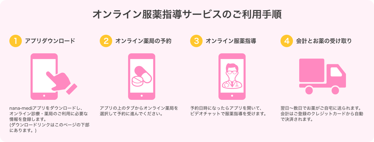 ◆オンライン診療と服薬指導をご利用の場合は、nana-mediのアプリから、オンライン診療を行い、その一連の流れで、オンライン服薬指導の予約をしてご利用いただくことが可能です。