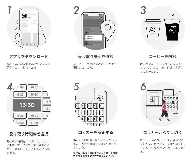 受け取りたいステーション(場所)と時間を指定して、コーヒーをアプリから注文することができます。受け取り時刻に合わせて淹れたコーヒーをロッカーから受け取るだけの新しいコーヒー体験です。