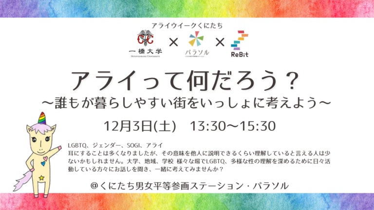 【初開催】「アライウィークくにたち」を12⽉3⽇〜12⽇に開催。国⽴市、⼀橋⼤学社会学部、認定NPO法⼈ReBitがともに、地域や学校でLGBTQの理解を広めることを⽬指し、イベントや展⽰を実施。