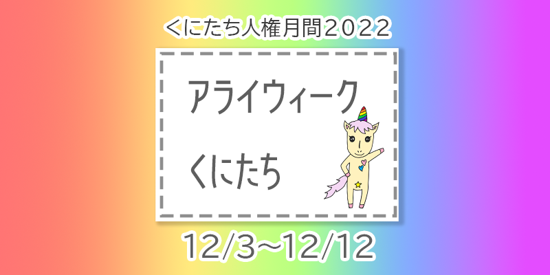 2022年12⽉3⽇(⼟)〜12⽇(⽉)に、「アライウィークくにたち」が初開催されます。本週間は、LGBTQについて学び話す機会を通じ、地域や学校のなかでLGBTQへの理解者である「アライ」が増えることを⽬指し、開催されるものです。
