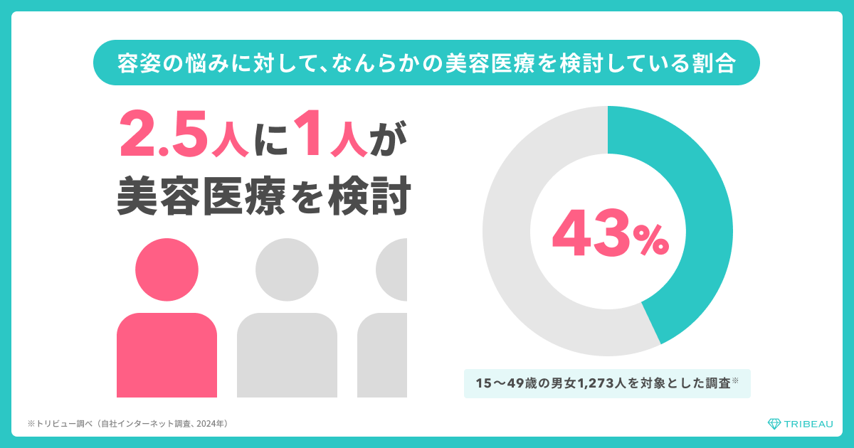 なかでも、医療機器のテクノロジー進化や試しやすい価格帯の韓国製薬剤の流通を追い風に、「アンチエイジング」「肌管理」をキーワードに、美容皮膚科における"メスを入れない"施術(非外科的施術)の認知が急速に拡大。15〜49歳の男女1,273人を対象とした調査(※1)では、約70%が容姿に悩みを抱え、約43%が何らかの美容医療を検討していると回答するなど、市場規模の拡大とともに、美容医療が人々の暮らしにおいて身近な選択肢となっていることが読み取れます。