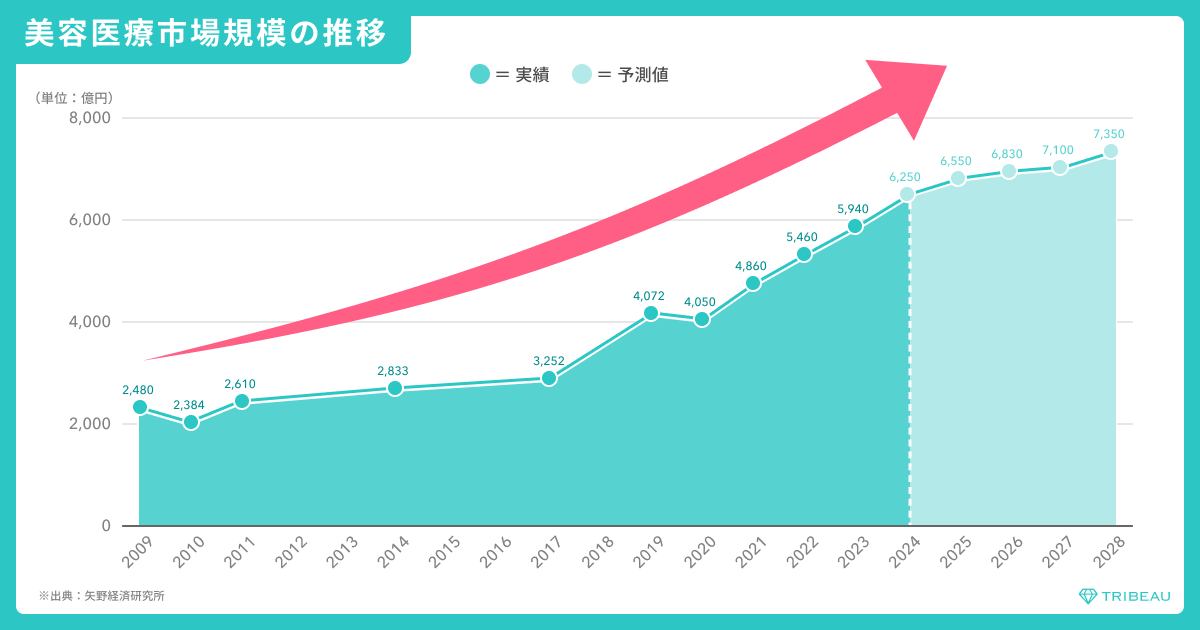 コロナ禍をきっかけに公共の場でのマスク着用やリモートワークがニューノーマルとなったことに加えて、オンラインでのコミュニケーションが定着し自分自身の顔を客観的に見る機会が増えたことを背景に、美容医療を検討する生活者が急速に増加。2021年の市場規模は対前年比120.0%の4,860億円となりました。脱毛・ボトックス注入・ヒアルロン酸注入・シミ取り・ピーリングなどの施術を中心に、2022年以降も引き続き需要が増加し、2023年には前年比108.8%の5,940億円に到達。2009年から2023年で市場規模は2.39倍に拡大しました。