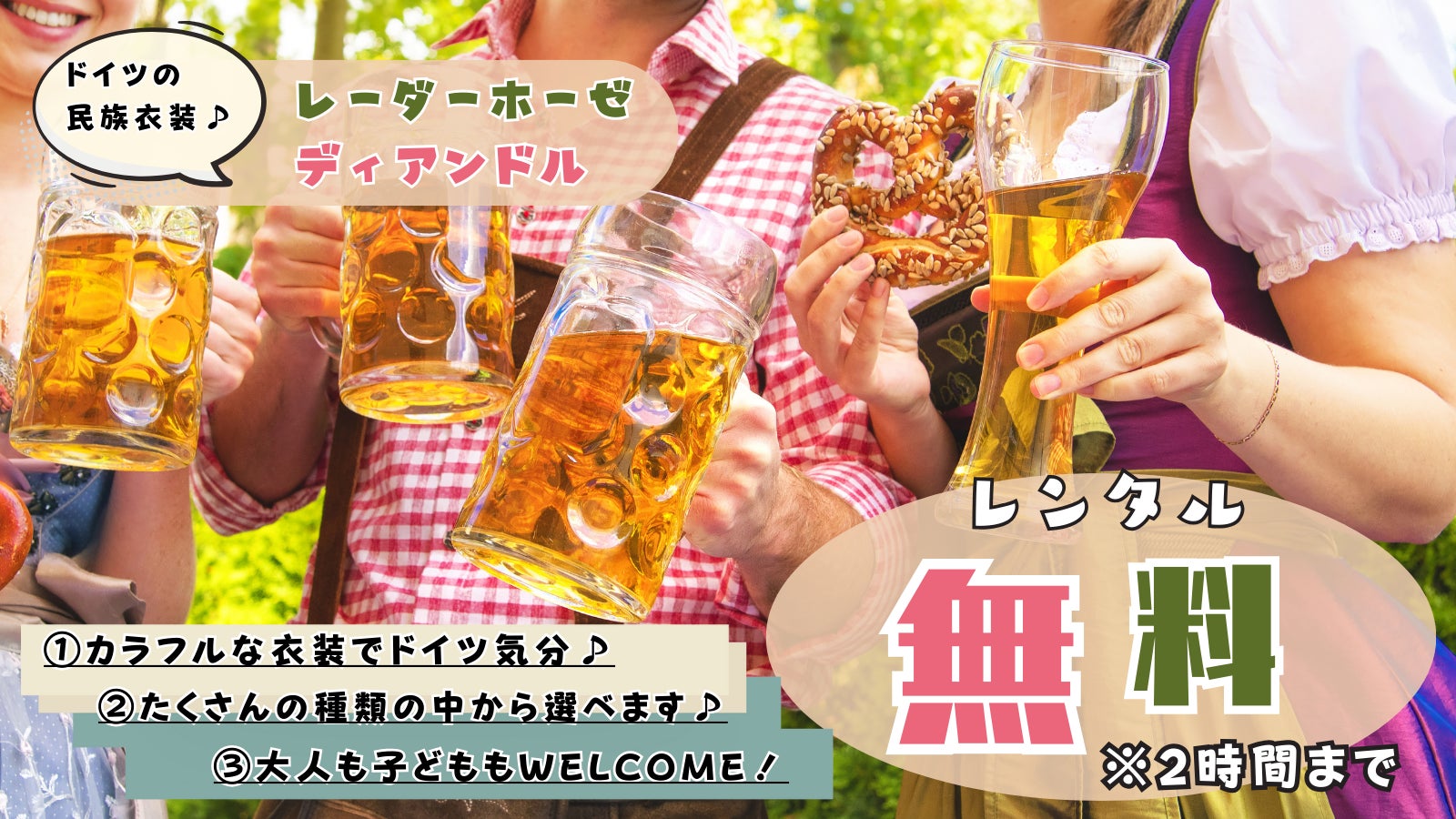 今年のオクトーバーフェストでは皆様にもっとドイツ文化やオクトーバーフェストを楽しんでいただけるように、春に開催する「お台場」と「芝公園(御成門駅前)」のオクトーバーフェストではディアンドルとレダーホーゼを会場内で無料で貸し出しを行います。