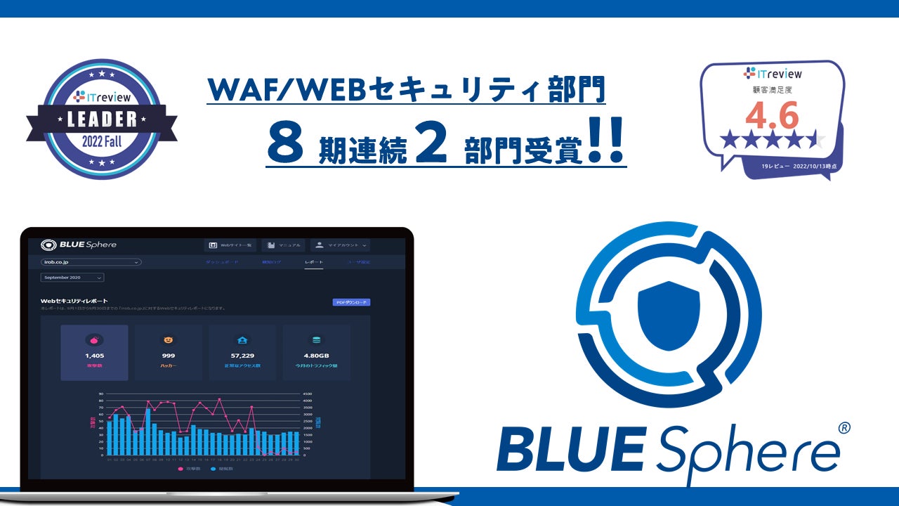 BLUE Sphere(ブルー スフィア)を提供する株式会社アイロバ(代表取締役:小林 直樹、以下「アイロバ」)は、2022年10月、アイティクラウド株式会社(本社:東京都港区、代表取締役社長 兼 CEO:黒野 源太)が発表した、掲載された製品レビュー(口コミ)をもとに選定され顧客満足度の高い製品に送られる「ITreview Grid Award 2022 Fall」において Webセキュリティ部門 と WAF部門 の「 Leader 」を受賞しましたのでお知らせいたします。