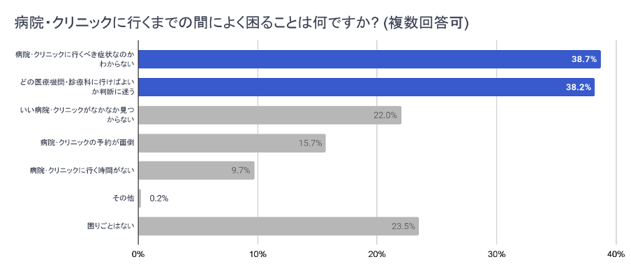 当社の調査では、体調不良時に病院やクリニックに行く際に困ることで最も多いのは、「病院・クリニックに行くべき症状なのかわからない(38.7%)」、次いで「どの医療機関・診療科に行けばよいか判断に迷う(38.2%)」という結果となりました(*2)。3人に1人以上の生活者が、医療機関に行くと判断してからの医療機関探しや予約よりも、その手前での医療機関を受診するか否かの判断に困っており、また「ネットで調べるほど、情報が多く混乱する」という状況に陥っているのが現状です。