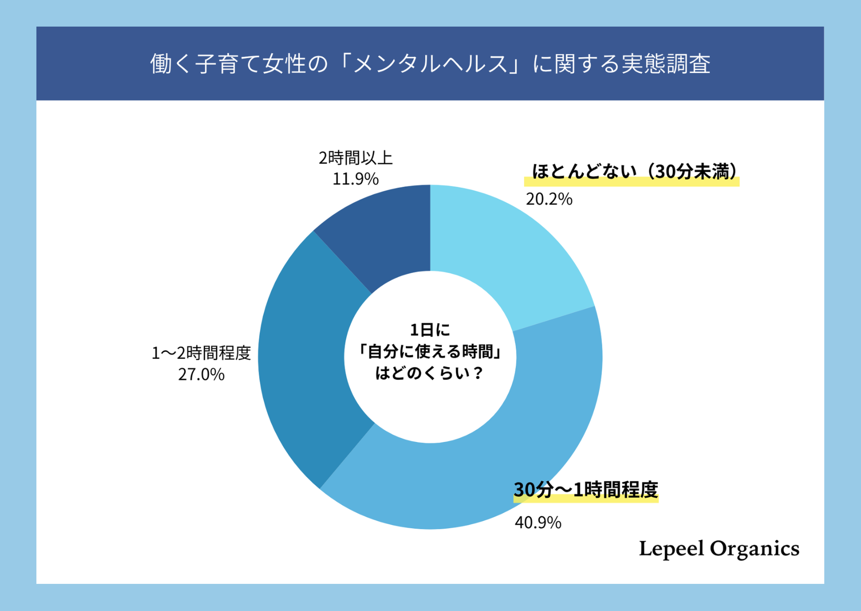 「自分のために使える時間」は「30分〜1時間程度(40.9%)」が最多。次いで「30分未満(20.2%)」となり、6割以上の女性が、1時間未満という極めて限られた時間で自身のケアを担っています。