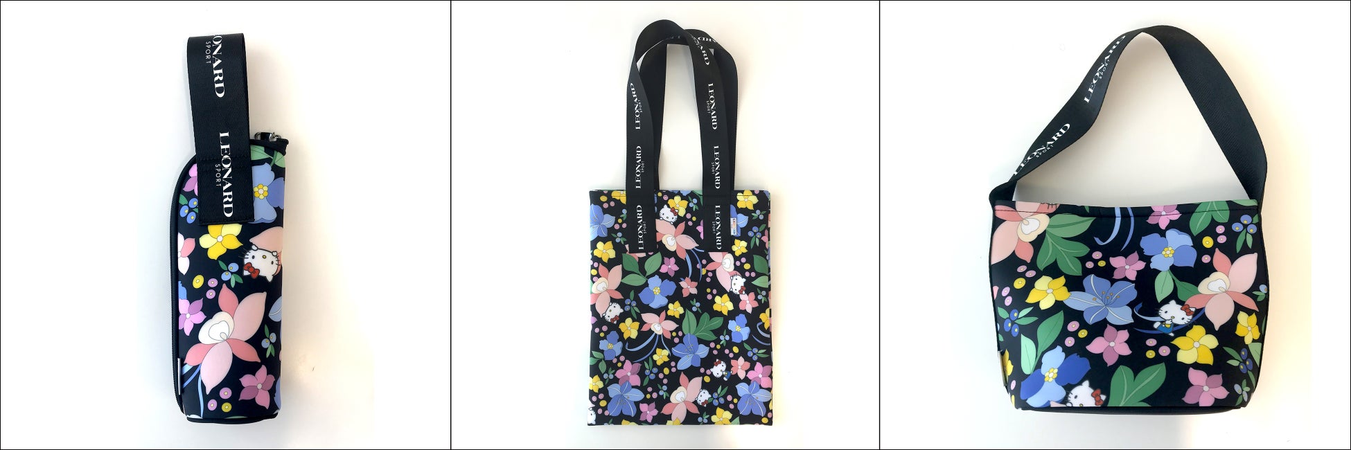 HELLO KITTY×LEONARD SPORTの世界観を表現したオリジナルフラワープリントのアイテムのほか、ハローキティがポイントのロングTシャツ、デニムパンツ、バッグ、ハット、靴下やスニーカーなど、ウエアから雑貨まで様々なアイテムを取り揃えています。