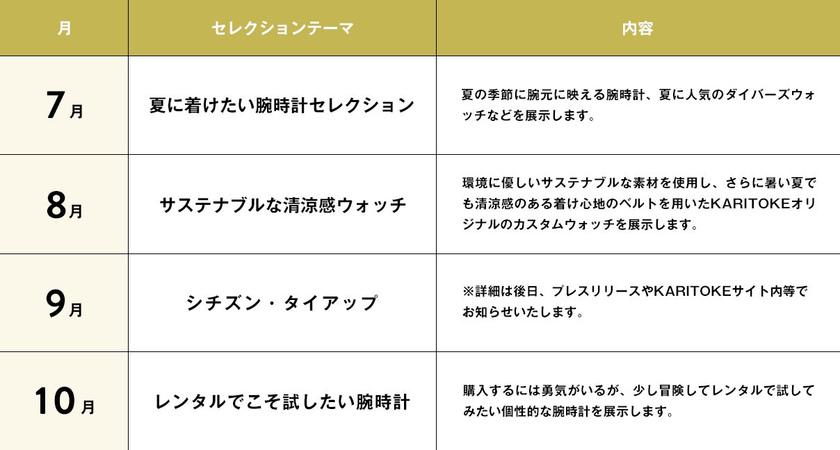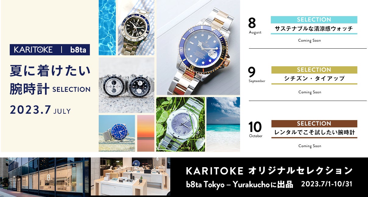 KARITOKEは、50ブランド1,300種類以上のブランド腕時計を月額制でレンタルし、交換しながら様々な腕時計を楽しんだり、気に入った腕時計は割引価格で購入もできるサービスです。今回、b8ta Tokyo - Yurakucho では、KARITOKEが扱う幅広いラインナップの中から月替わりでテーマを設定し、KARITOKEオリジナルセレクションを展示します。各月のテーマは下記の予定です。