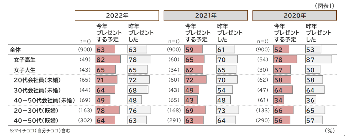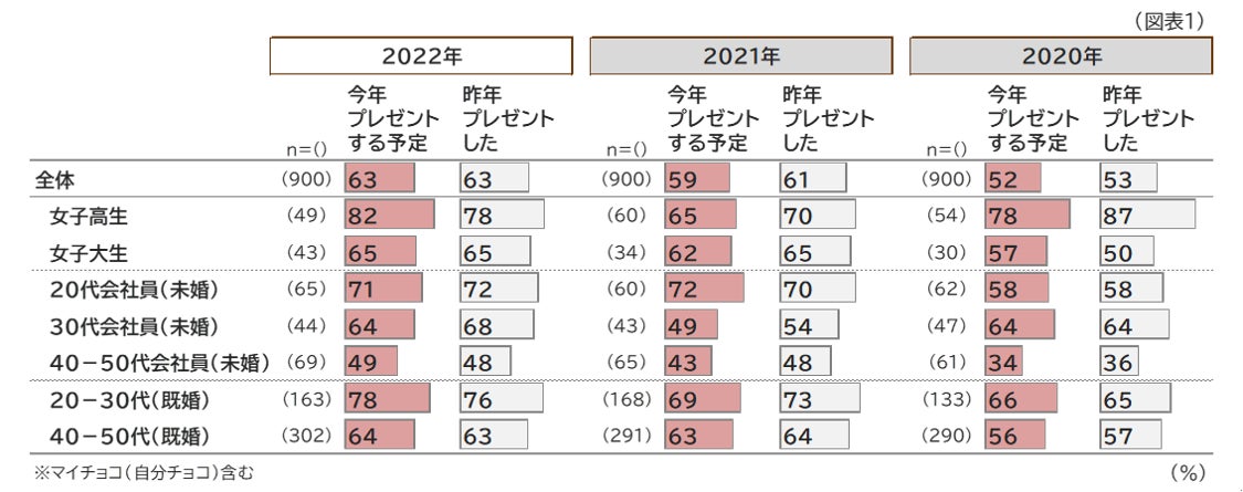 - 今年チョコをプレゼントする予定なのは 63%で、昨年と同様。最も予定しているのは「女子高生」で、82%が「渡す予定あり」と回答(2021年の同65%より上昇)。
