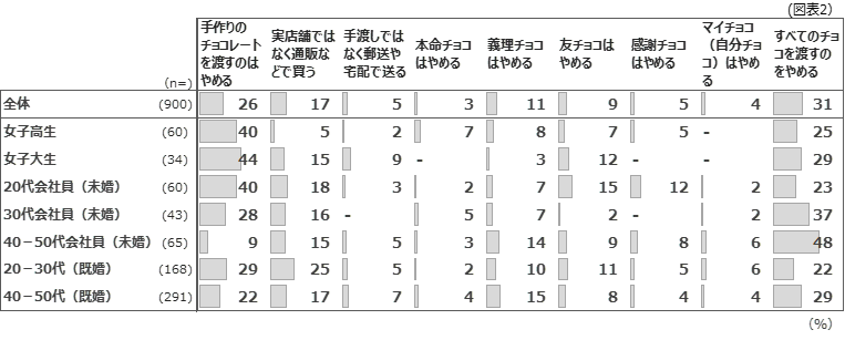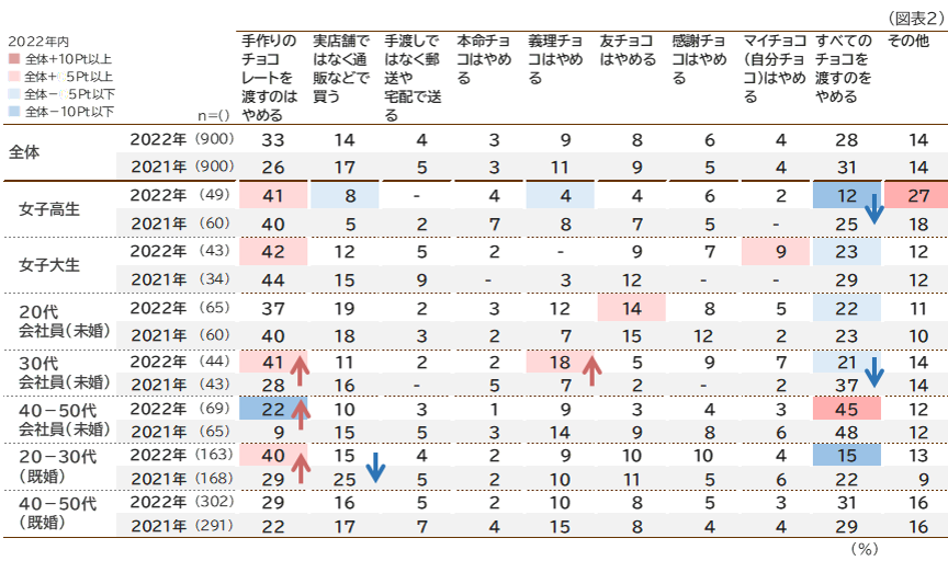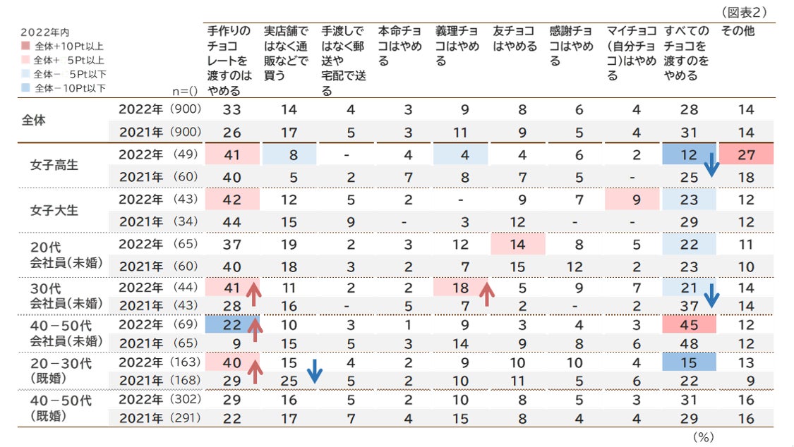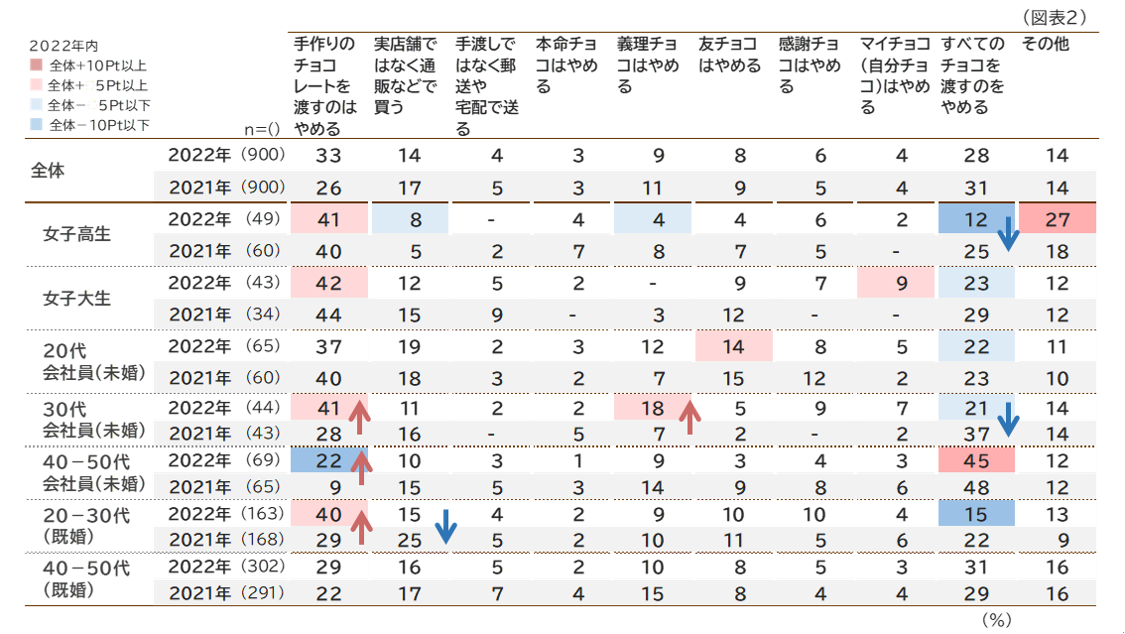 新型コロナウイルスの影響としてあてはまるものでは「手作りのチョコレートを渡すのはやめる」が33%と最も高くなっています( 2021年より7ポイント上昇)。 「30代会社員(未婚)」「40‐50代会社員(未婚)」においては、2021年より各13ポイント上昇しています。次いで高いのは「すべてのチョコを渡すのをやめる」ですが、特に年代の低い層において2021年より減少傾向にあり、特に「女子高生」「30代会社員(未婚)」では2021年より10ポイント以上も減少しています。(図表2)