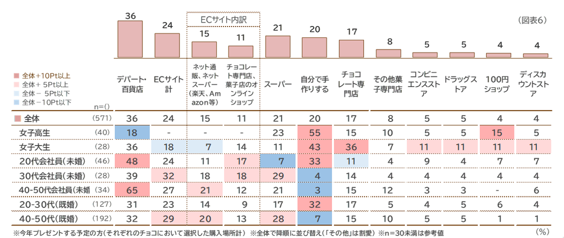 購入予定場所としては「デパート・百貨店」が全体で最も高く36%、次いで「ECサイト計(「ネット通販、ネットスーパー」「チョコレート専門店、菓子店のオンラインショップ」)」が24%となっています。若年層では「自分で手作りをする」も高く、「女子高生」では55%となっています。(図表6)