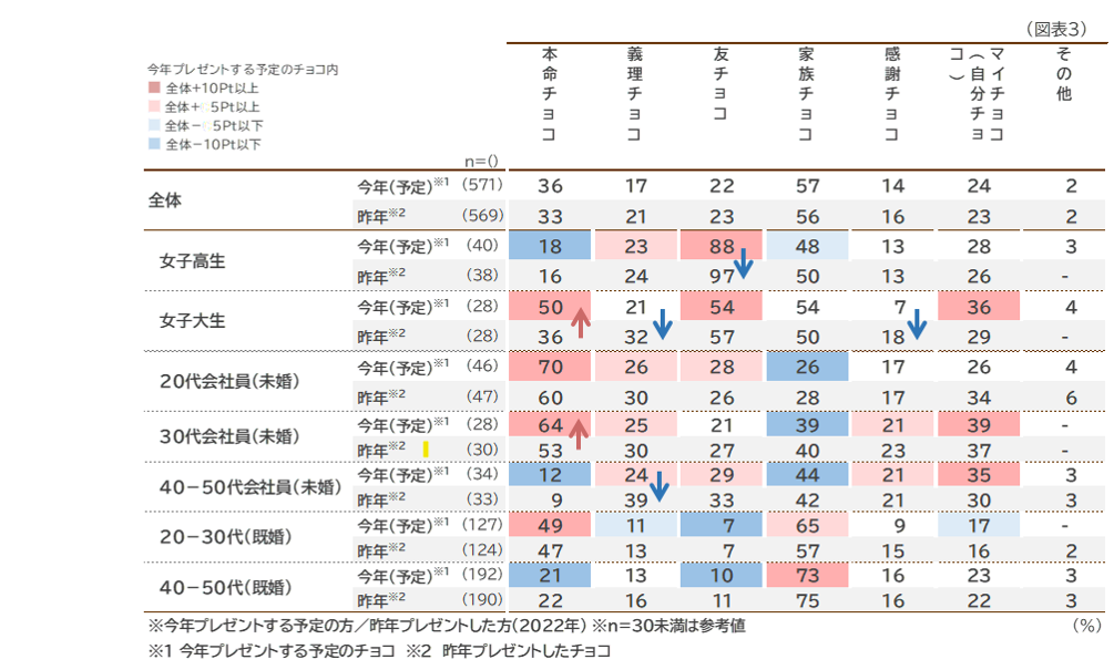 - 「本命チョコ」は、「女子大生」「20-30代会社員(未婚)」等で特に上昇。「20代会社員(未婚)」は70%が「今年プレゼントする予定」と回答。