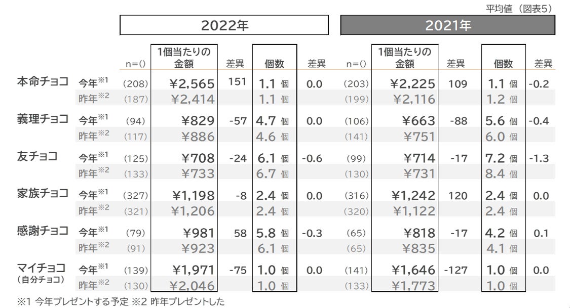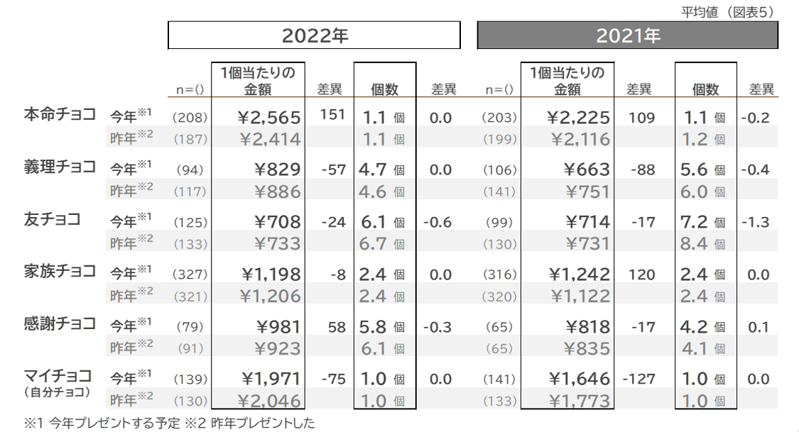 最も予算をかけるつもりなのは、2021年同様に、やはり「本命チョコ」で、1個当たりの金額は平均2,565円です。次いで「マイチョコ(自分チョコ)」に予算をかけると回答した方が多く(同1,971円)、自分へのご褒美には予算をいとわない傾向も、引き続きみられます。2022年の傾向としては、「友チョコ」「義理チョコ」の個数が2021年との比較で、減少していますが「感謝チョコ」の個数は上昇しており、相手を厳選しつつも、感謝はきちんと伝えたいといった様子もうかがえます。(図表5)