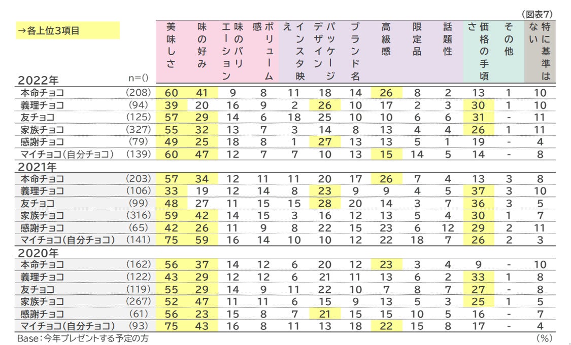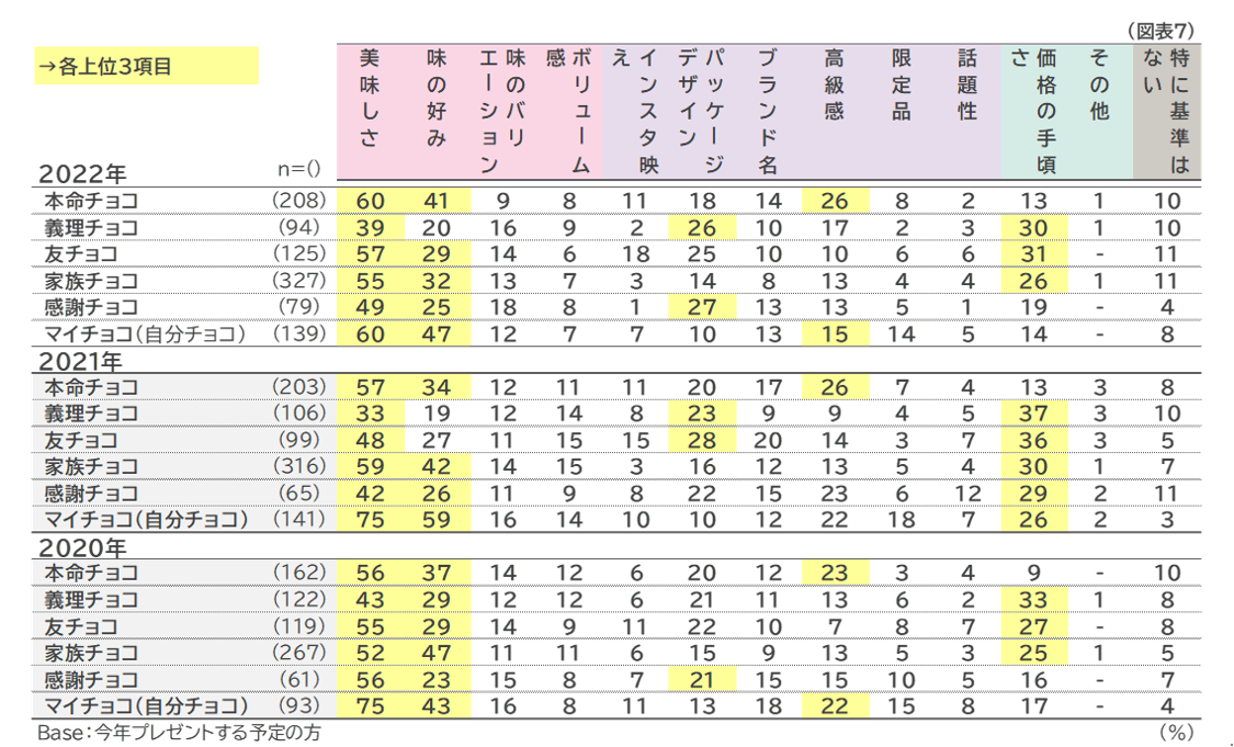 選ぶ基準としては、2021年までと同様、全体的に「美味しさ」「味の好み」が中心ですが、これまで基準とされがちだった「価格の手ごろさ」は2022年はやや減少傾向にあります。その他「ボリューム感」も2021年より各チョコとも減少しており、お手頃さ・量よりも、より質重視の傾向をうかがわせる結果となっています。 (図表7)