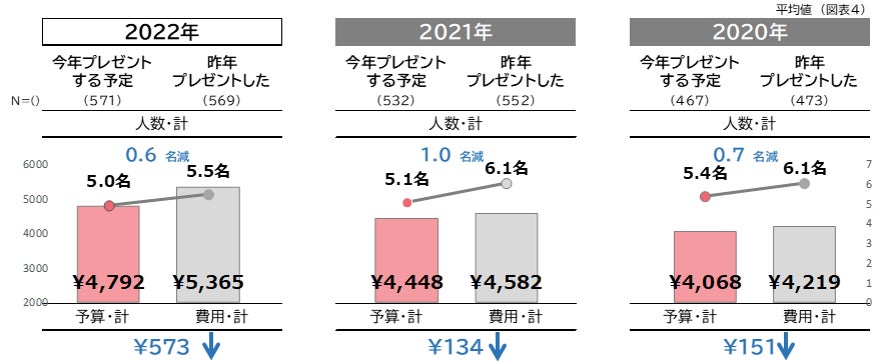 - 今年の予算計は平均4,792円で、2021年に続き上昇傾向だが、プレゼントする予定の人数計は平均5.0名と減少傾向。より厳選した相手に、しっかりとお金をかける傾向が引き続き強まっている。