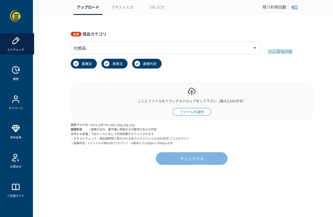 広告チェックAIは、新たに画像形式のjpeg、jpg、pngファイルに対応しました。これにより、より多様な広告素材を簡単にチェックできるようになり、ユーザーの利便性が格段に向上します。