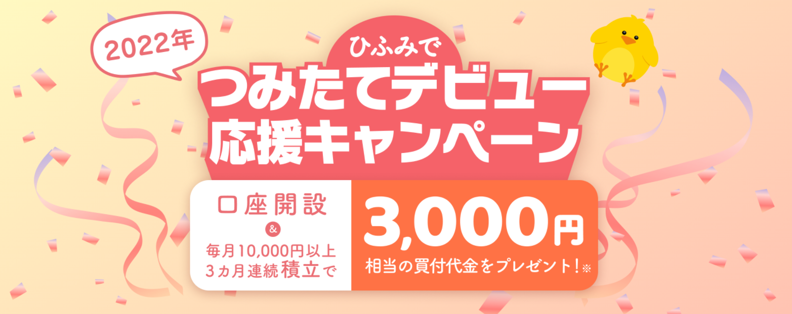2022年1月1日から2022年3月31日までに初めて当社で口座開設を申し込み、口座開設後に毎月10,000円以上3カ月連続積立購入を行なったお客様に、3,000円相当の買付代金をプレゼント(※)いたします。
