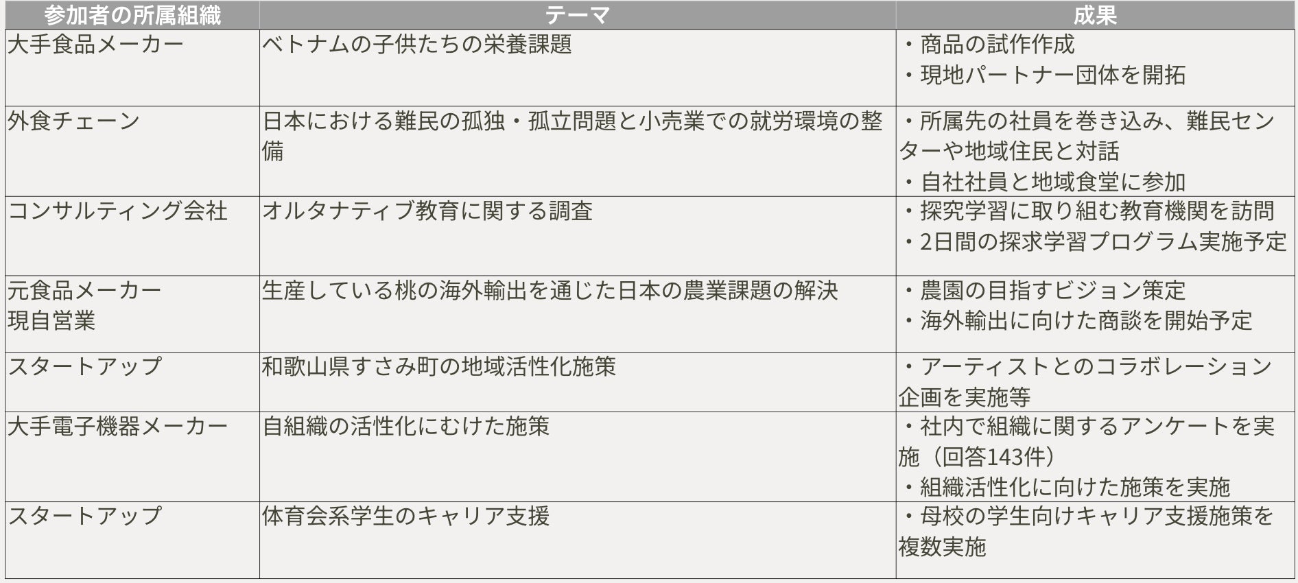2023年11月〜24年5月に実施したSAP第一期には、留職プログラムや社会課題体感フィールドスタディのアラムナイ7名が参加。自身の関心事を探求し、行動へと移していきました。参加者の取り組みテーマは以下の通りです。