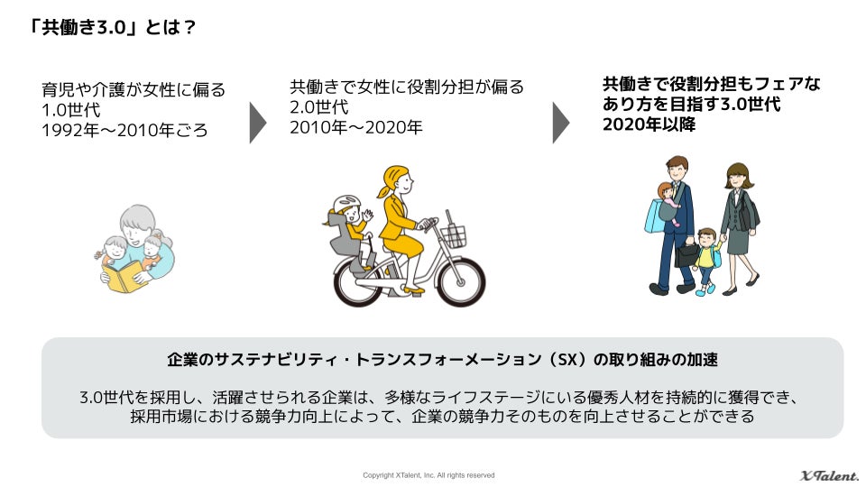コロナ禍という大きな時代の転換期を経て、性別的役割にとらわれず、仕事も家事育児もフェアなあり方を目指す「共働き3.0世代」が増加しています。私たちXTalentは、「共働き3.0世代」が企業の中核を担い、変革を起こすことで、それに続く世代に大きな影響を及ぼすことができると考えています。