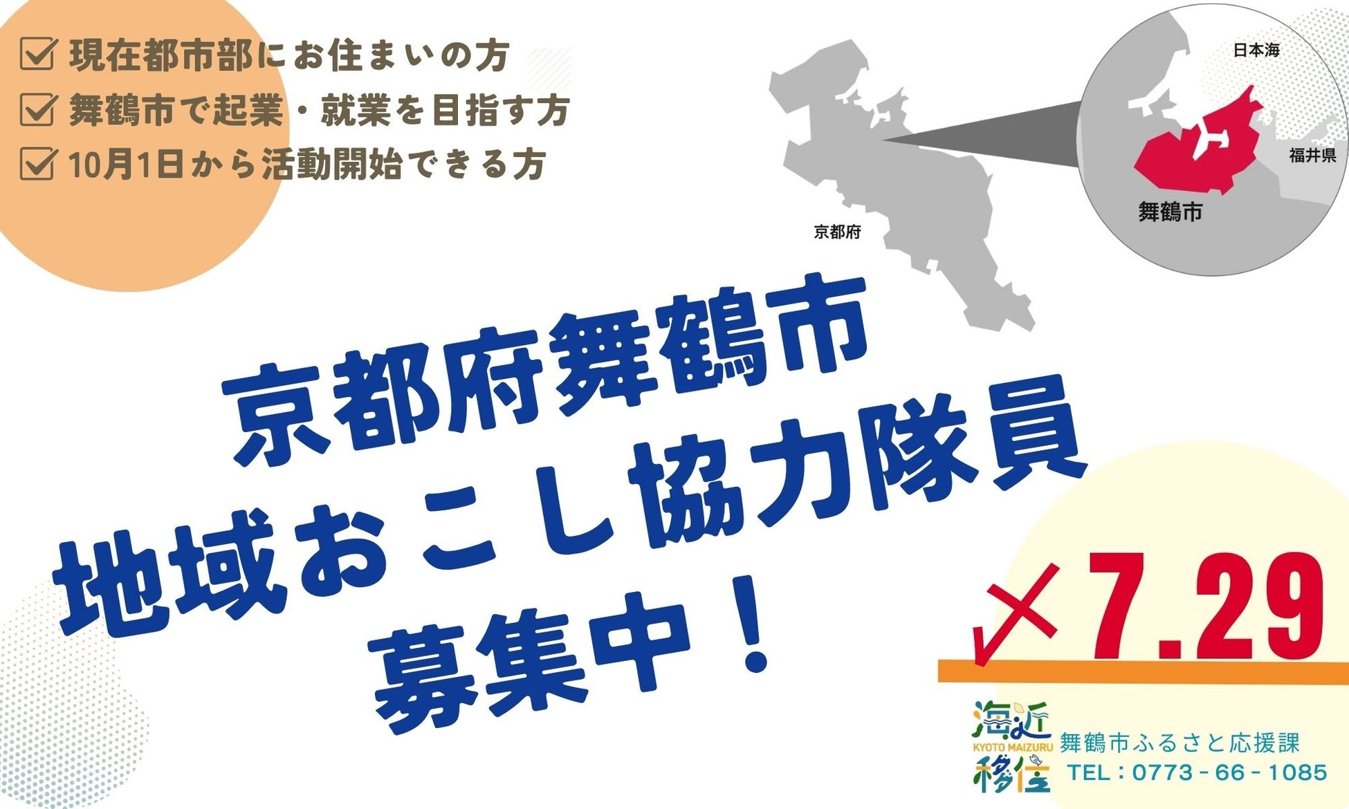 京都府舞鶴市では、地域おこし協力隊の制度を活用し、地域力の維持・強化を図るため、7月29日までの間、新たに2名の隊員を募集します。