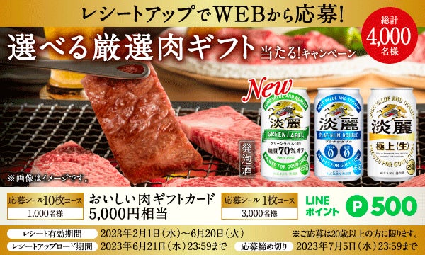 2023年7月5日(水)まで、「淡麗シリーズ 選べる厳選肉ギフト当たる!キャンペーン」を実施中です。対象商品の購入金額100円(税込)ごとに応募シールが1枚貯まります。応募シールの枚数に応じてお好きなコースにご応募いただくと、その場の抽選で賞品が当たります。