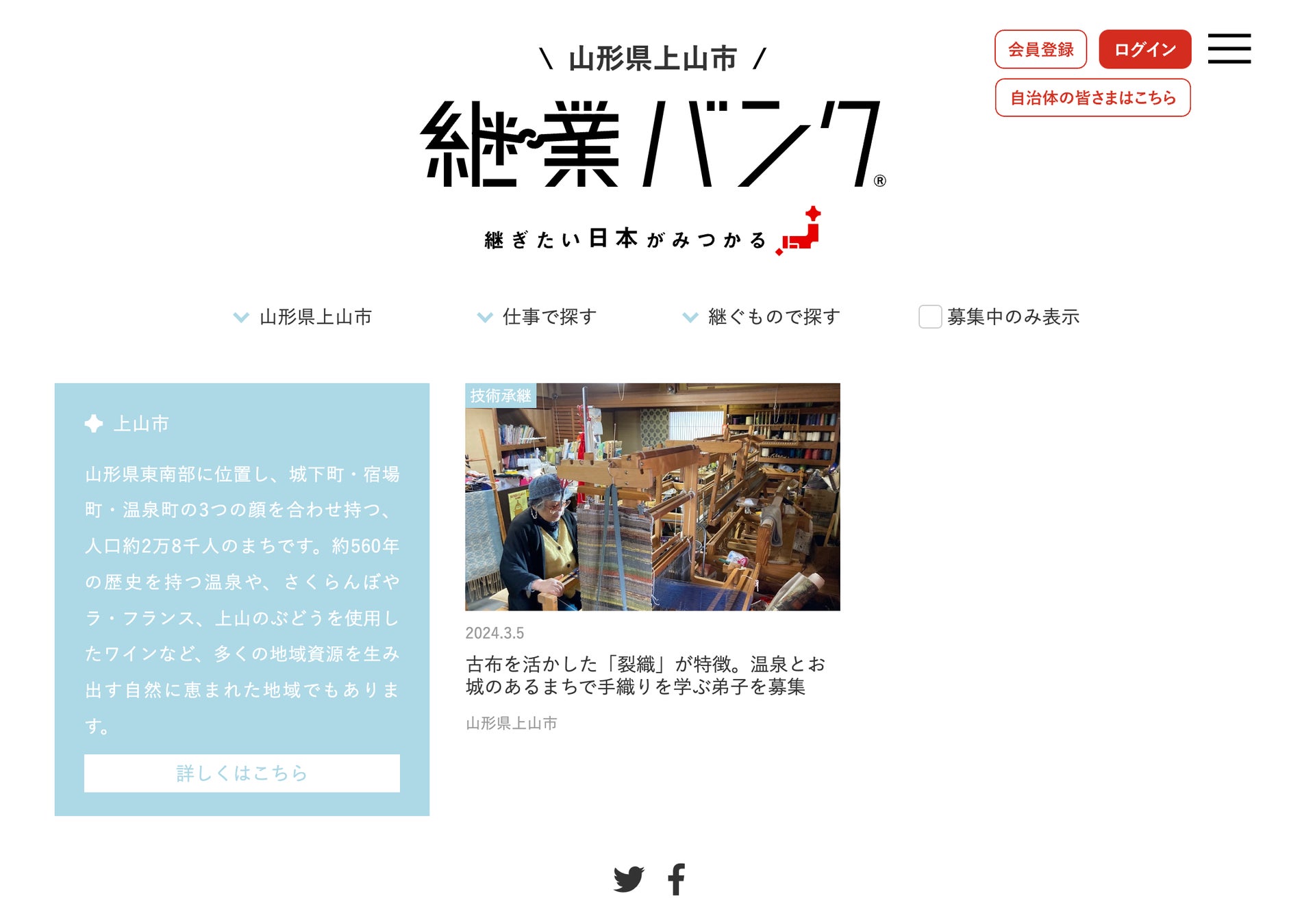 ココホレジャパン株式会社は、上山市が参加した、独立行政法人中小企業基盤整備機構東北本部・経済産業省東北経済産業局の「令和5年度自治体関与型中小企業事業承継支援モデルの構築・展開事業」における「自治体モデル実証事業」において、上山市と連携し、市内事業者の後継者意向を調査。同事業を機に、後継者募集の要望のあった「手織工房 綿屋」の後継者を募集するため、2024年3月に山形県内初となる事業承継版の空き家バンク「山形県上山市継業バンク」を開設し、後継者募集を開始しました。本協定に参加することにより、地域の支援機関との連携を深め、上山市内の事業者の円滑な事業承継の促進に取り組みます。