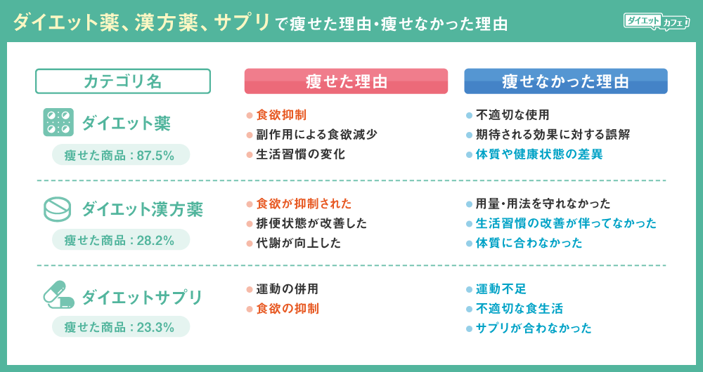 薬、サプリとして「ダイエット薬」「ダイエット漢方薬」「ダイエットサプリ」の痩せた理由と痩せなかった理由を調べました。