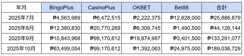 調査対象サイト:BingoPlus、CasinoPlus、OKBET、Bet88