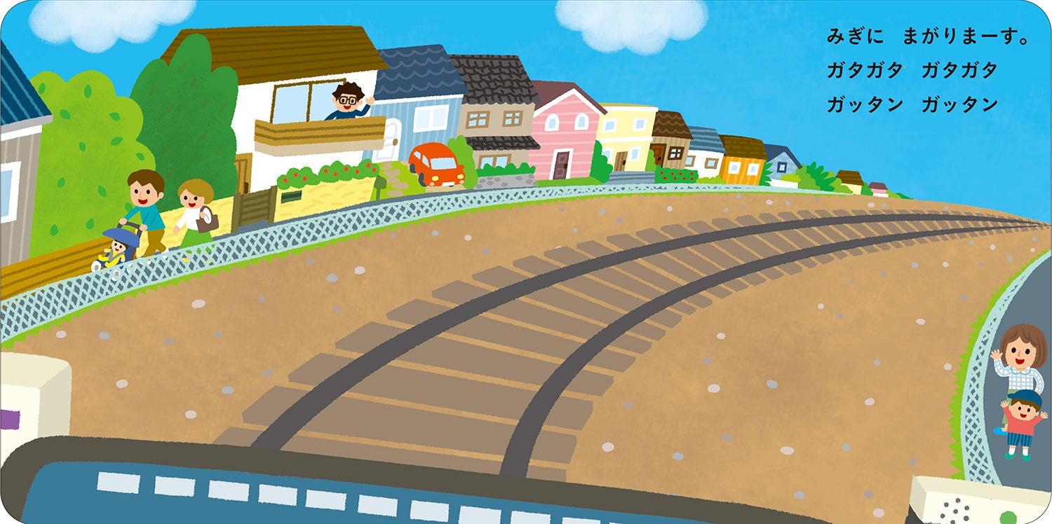 この絵本を広げたら、おひざの上が赤ちゃんの運転席に早変わり。絵本をめくると景色が変わっていきます。ガタンゴトン揺れて、右へ左へおっとっと。自由に動きをつけて楽しんでいただけると嬉しいです。沿線の町の人たちの様子も、ぜひ見てみてくださいね。