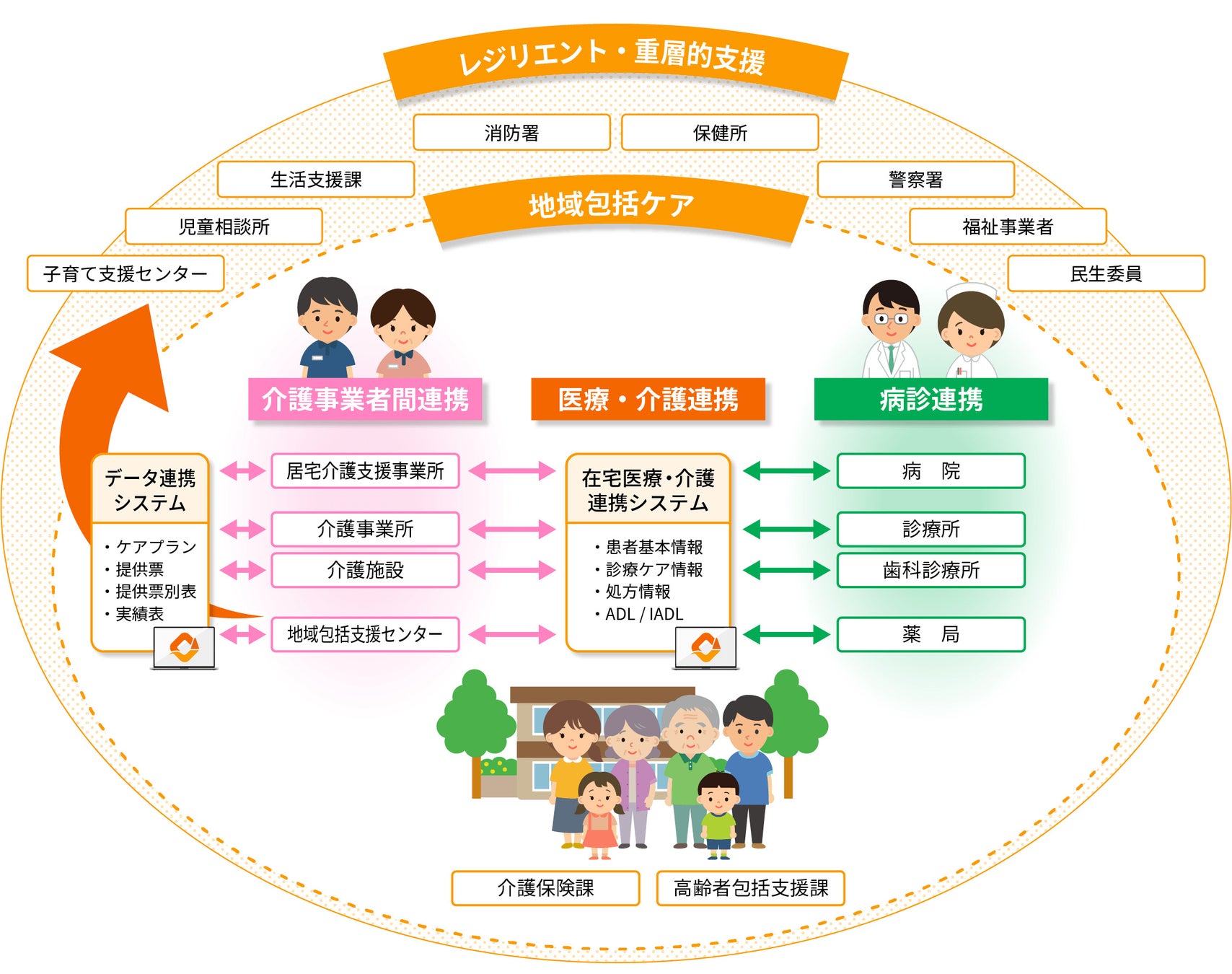 超高齢社会に求められる「地域包括ケアシステム」の実現に寄与するために、地方自治体や医師会及び介護サービス事業者向けの多職種間連携を可能にする地域連携型クラウドサービス。多職種他法人間の連携を目的とした情報共有システムと、介護事業者向けの業務システムをご提供しております。