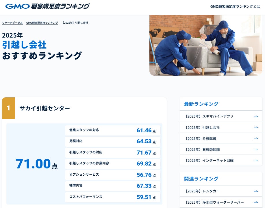 株式会社サカイ引越センター(大阪府堺市:代表取締役社長 田島哲康)は、GMOリサーチ&AI株式会社が2025年4月1日に初のランキングリリースした「GMO顧客満足度ランキング」において、「2025年 引越し会社」部門の総合満足度で第1位を獲得しました。