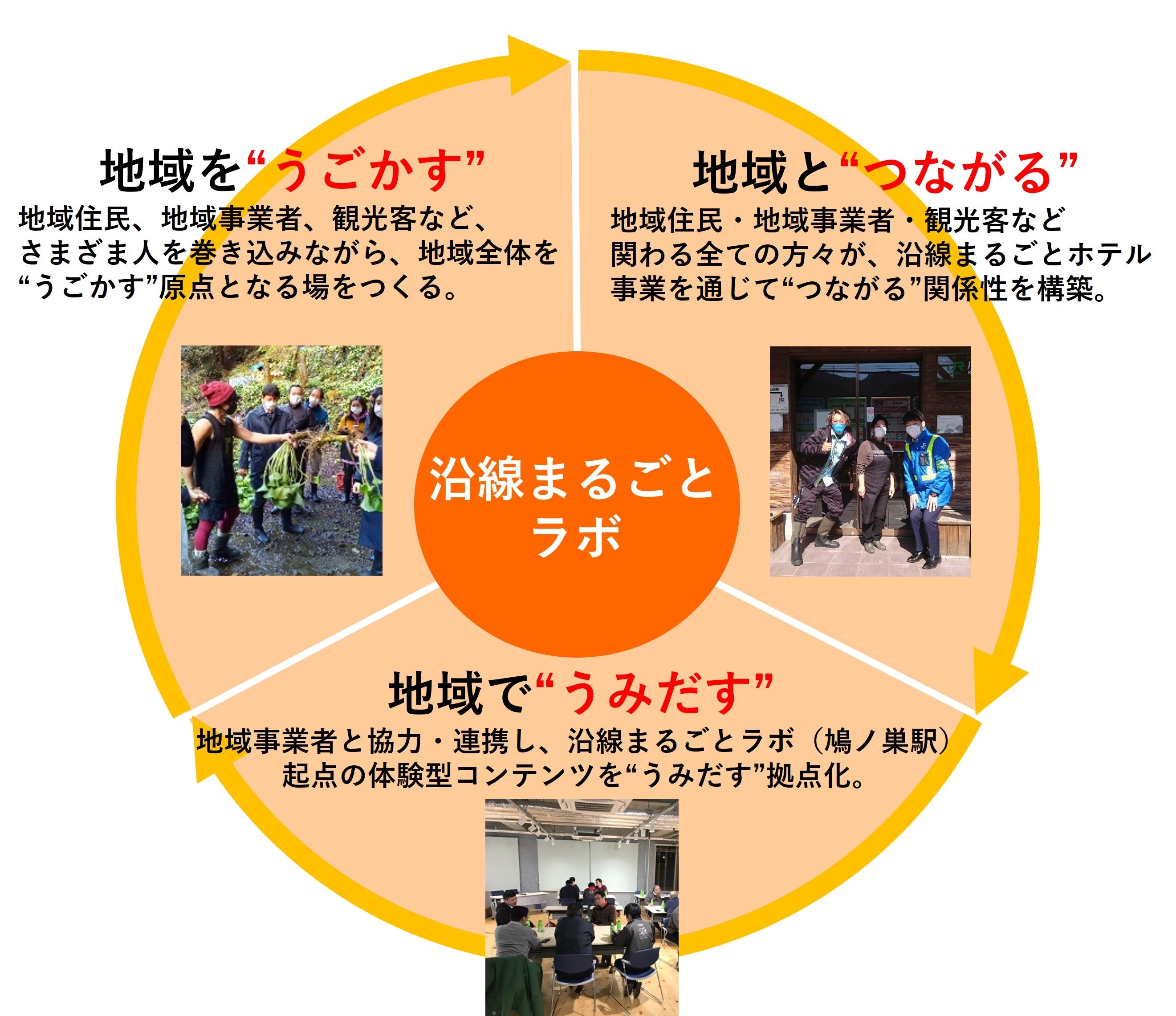 ”沿線まるごとラボが熱源となり、地域住民、地域事業者、観光客のみならず、国、都道府県、沿線自治体、都市部の企業など、さまざまな人・組織を巻き込みながら、JR青梅線沿線に新たな人の流れと活気を生み出し、地域を“うごかす”ほどのインパクトの創出を目指します。さらには、JR青梅線での試みが、新たな「地方創生」、「沿線活性化」のモデルとなり、全国の沿線や過疎高齢化に直面する地域にも活動・事業が広がることも目指します。