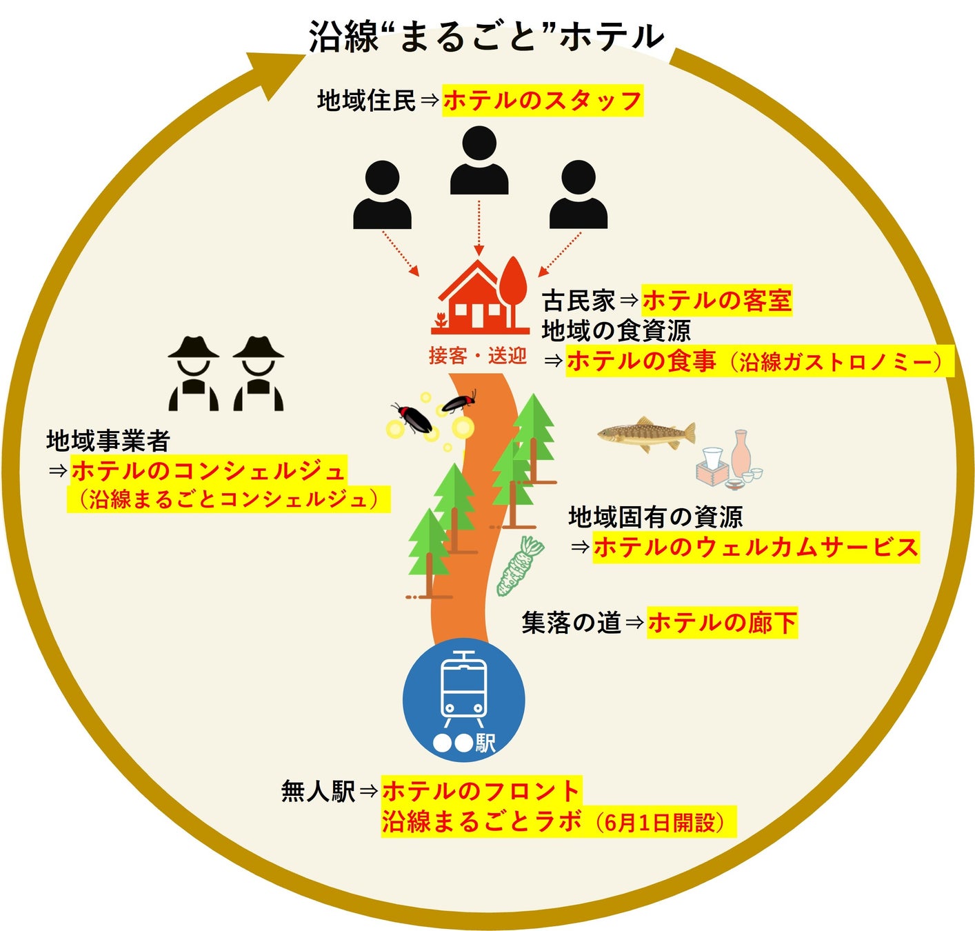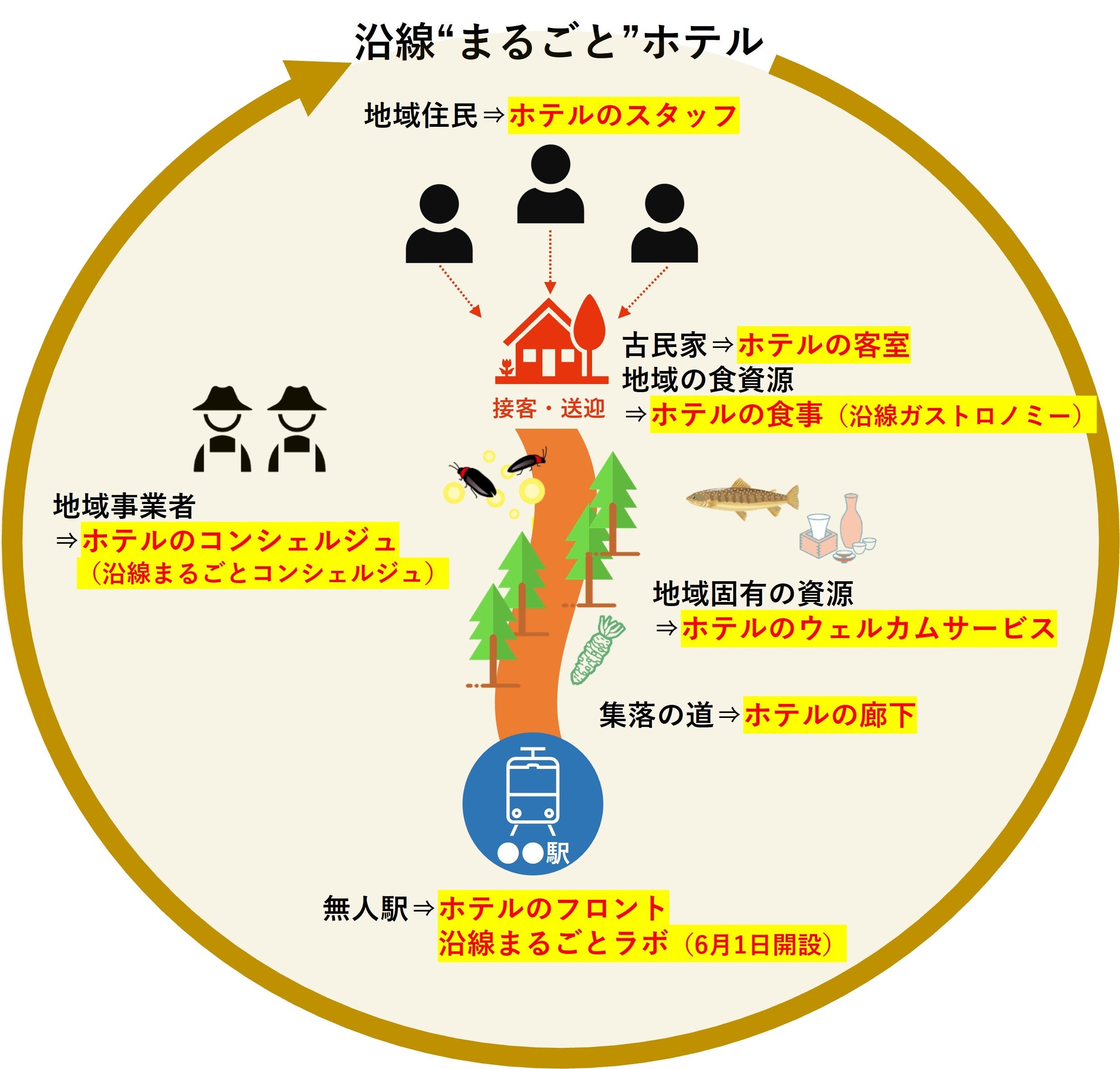 「沿線まるごとホテル」事業とは、JR東日本の駅舎や鉄道施設などを「ホテルのフロント」として活用、沿線集落の古民家(空き家)を「ホテルの客室」に改修、さらには地域住民とともに接客・運営(「ホテルのキャスト」)を行うことで、「沿線まるごとホテル」の世界観を構築し、新たな滞在型観光、マイクロツーリズムの創出を図るものです。