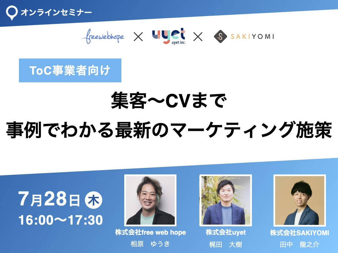 株式会社free web hope(本社:東京都千代田区、代表取締役:相原ゆうき)、株式会社SAKIYOMI (本社:大阪府大阪市、代表者:石川 侑輝)、株式会社uyet(本社:東京都渋谷区、代表:金井洸樹)の3社は、無料のオンラインセミナー「集客〜CVまで 事例でわかる最新のマーケティング施策」を7月28日(木)に開催いたします。(申し込み先:https://bit.ly/3PmPBMc)