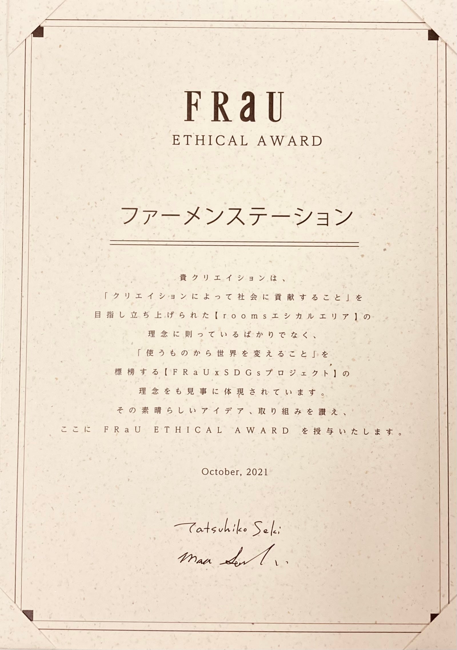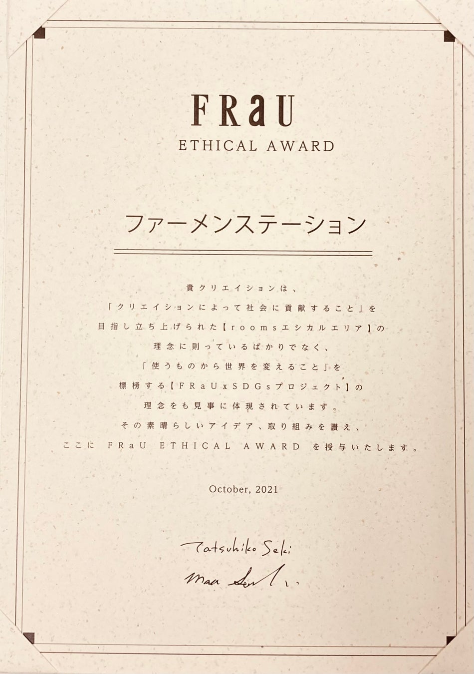 ファーメンステーションが創業以来大切にしている、未利用資源を再生・循環させる『循環型社会』構築の取り組みが評価され、エシカルな製品作りに取り組むブランドに贈られるFRaU Ethical AWARD を受賞しました。