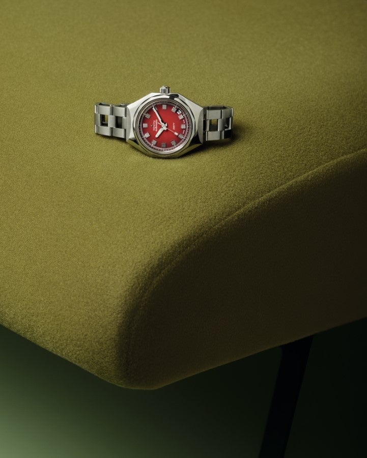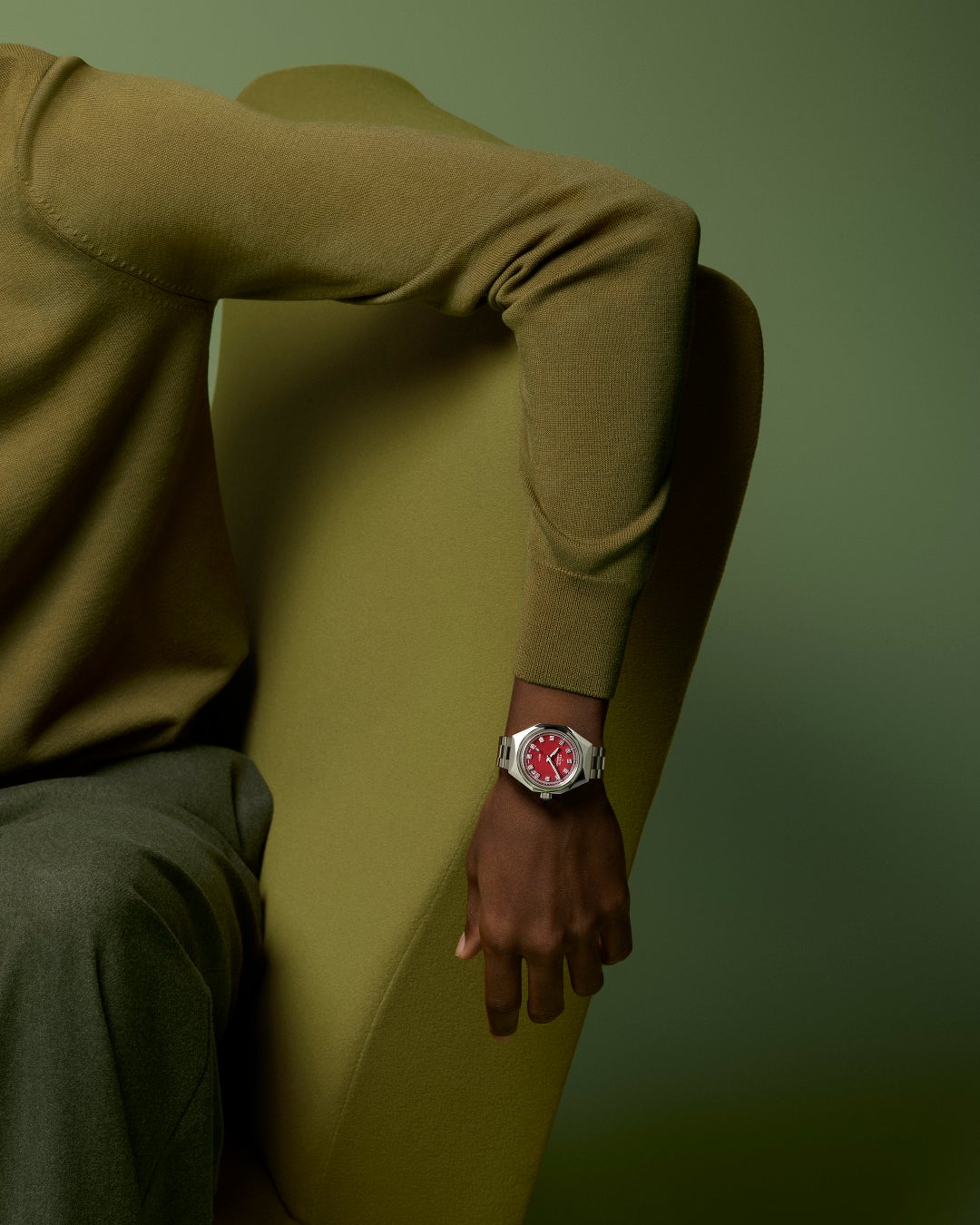 歴史的な製造計画を使用して驚くほど正確なディテールで再現されたデファイ リバイバル A3691は、現代のデファイ コレクションにインスピレーションを与え続ける、オリジナルをその時代に非常に際立たせたあらゆるディテールと特異なデザイン要素を復活させています。ファセットを施した八角形のケースと14面のベゼル、エッジに向かって濃くなるヴィネット仕上げが際立つ深い光沢のあるレッド文字盤、水平方向の溝を持つ珍しいアプライド アワーマーカー、そして現在はよりモダンで、人間工学的なフォールディングクラスプに変更されたアイコニックなゲイフレアー社のスチール製「ラダー」ブレスレットのデザインなど、さまざまな特徴を備えています。