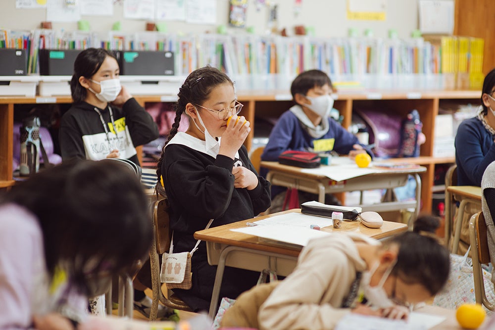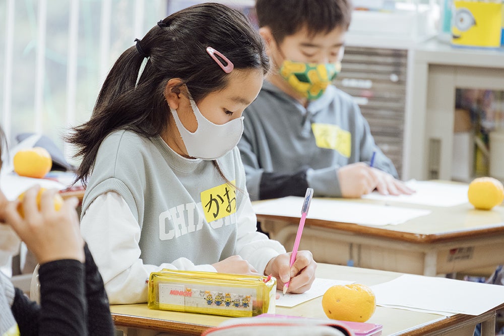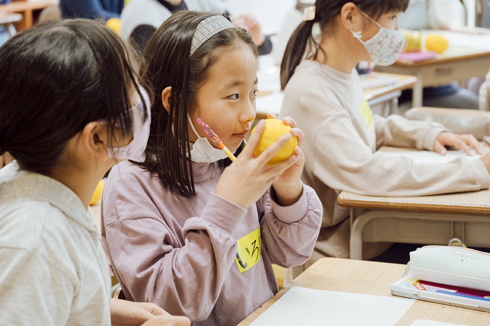 今回は、小学4年生18名が、女優の水沢エレナさんと共に「ゆずの香りから絵本を創る」授業を体験。香りから言葉を紡ぎ、自分だけの絵本を創作するこの体験では、香りを基点に言葉を連想していくことで、子供たちの素直な感性を刺激し、自然と言葉を導き出します。生徒たちは目を閉じ、ゆっくりとゆずの香りを嗅ぎながら、「香りだけを感じた時にどんな色が思い浮かぶか?」などの質問に、言葉を書き出していきます。