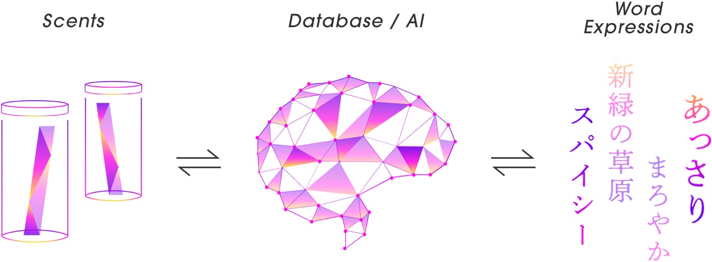 KAORIUMは、セントマティックが開発した香りと言葉を相互に変換するAIシステムです。最先端のテクノロジーによって、曖昧で捉えにくい香りの印象を言葉で可視化したり、ある言葉に紐づく香りを導き出したりすることを可能にします。また、言葉を意識しながら香りを深く味わう体験は左右両脳を活性化し(※1)、私たちのまだ見ぬ感性への気付きをもたらします。香りと言葉をつなぐ今までにない体験が生み出す価値は、フレグランスの世界にとどまらず、感性教育、飲食体験、購買体験など様々な分野に新しいビジネスチャンスを生み出すものとして、その可能性に大きな期待が寄せられています。