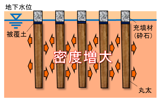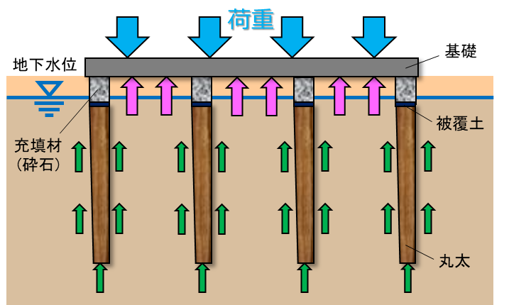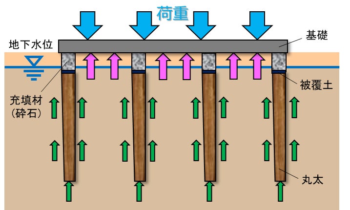 本工法は軟弱地盤に丸太を圧入し地盤と丸太の双方で構造物を支える工法です(LP-SoC工法)。丸太は頭部を地下水位より深く設置し、腐朽や蟻害による生物劣化を防ぎます。圧入した丸太頭部を特殊な粘土で覆い地下水位の増減による影響を回避し、丸太頭部から基礎までを充填材(砕石)で締固め埋戻します。