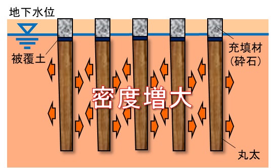 ・丸太の本数を増やして密に配置すると液状化対策にもつながります(LP-LiC工法、第一号物件で採用)。