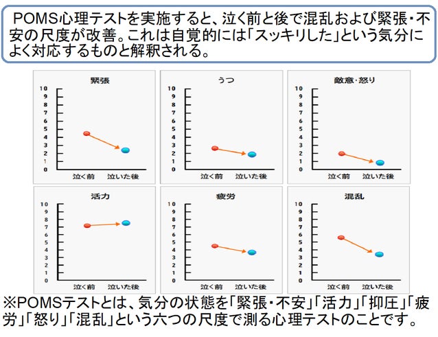 「涙活(るいかつ)」とは、意識的に涙を流すことでストレスを発散する方法です。人は、2分から3分ほど泣くだけでも、自律神経が交感神経(=緊張や興奮を促す神経)から副交感神経が優位な状態(=脳がリラックスした状態)へとスイッチされるといわれています。泣くことで脳が癒され、たまったストレスをスッキリ解消することができると考えられるのです。また「心の混乱」や「怒り」、「敵意」も軽減することが研究でわかっています。