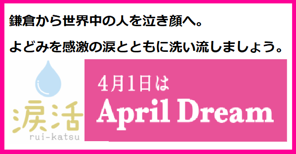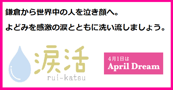 意識して涙を流す「涙活(るいかつ)」は、現代人に適した心のデトックス方法です。通称「なみだ先生」として、企業・自治体・教育機関・医療機関・福祉施設向けの「涙活(るいかつ)」セミナーや講演を手がけている、感涙療法士の吉田 英史は、世界感涙デーの7月9日に、鎌倉で、涙活フェスを実施し、世界に向けて発信します。“世界中の人を笑顔に”ならぬ、“世界中の人を(感動で)泣き顔に”して、ストレス解消の機会を提供します。また“泣き顔”で今も世界各地で勃発する紛争をなくしていくことにも寄与していきます。