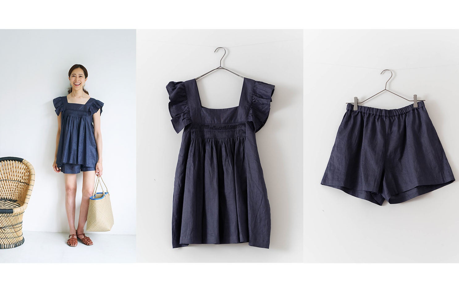 〈RAMIE PINTUCK TUNIC WITH SHORT PANTS (NAVY) ¥30,800〉